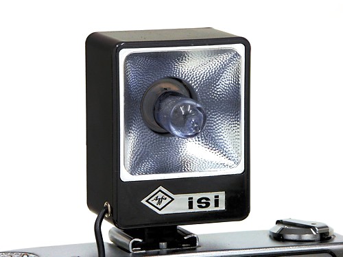 Kompakter Blitz für Blitzlampen. Der Agfa ISI verfügt über keinen Mittelkontakt, er eignet sich nur für Kameras mit PC-Buchse. Seine Ausmasse sind extrem kompakt und machen ihn so zum optimalen Begleiter. Auf der Rückseite des Blitzgerätes ist die zur Zündung notwendige Batterie untergebracht. Es gab den Blitzer wahlweise in der Ausführung mit Mittenkontakt und der mit Kabelanschluss.