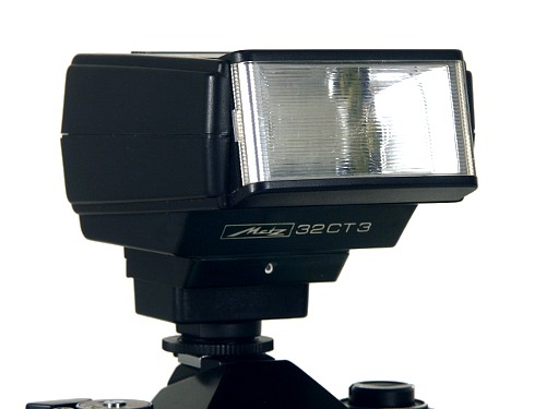 Der Metz 32C T 3 war in den 1980'er Jahren der meist verkaufte Blitz in Deutschland, auch ich hatte ihn in Gebrauch. Ausreichend leistungsstark und kompakt in den Ausmaßen war er ein zuverläs- siger Begleiter. Der Reflektor kann vertikal und horizontal geschwenkt werden und erlaubt so indirektes Blitzen in alle Richtungen. Über das SCA 300 Wechselanschluss System war er kompatibel mit nahezu jeder analogen SLR Kamera. Einstellung der Blende, Blitzbereitschaft, automatische Einstellung der Synchronzeit usw. wurden vom Blitz in die Kamera übertragen. Zur Verfügung stehen hier 3 Computerblenden, manuelles Blitzen und für kompatible Kameras TTL Messung. Aufgerüstet werden konnte der Metz 32 CT 3 zum Stabblitzgerät mit dem Power-Griff G 15, wie er bei mir auch im Einsatz war. Im Bild rechts sind oben das Deckblatt der original Bedienungsanleitung und unten das Deckblatt des SCA 300 Systemes zu sehen.