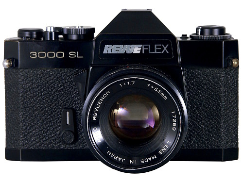 Eine klassische SLR der 1970'er Jahre im edel schwarz lackierten Gehäuse vom Versender Foto Quelle. Die Kamera wurde von Chinon in Japan gefertigt und wie bei Foto Quelle üblich unter dem Label Revue verkauft. Das Original wurde unter der Bezeichnung Chinon CX verkauft. Zeitgemäß ist sie mit einer Nachführmessung bei Arbeitsblende ausgestattet, die über den Schiebeschalter seitlich am Spiegelkasten eingeschaltet wird. Anders als bei den Praktica Kameras muss dieser Schalter eingerastet werden, welches ein nicht so schnelles Arbeiten ergibt. Eine Besonderheit die man oft bei Kameras von Chinon antrifft ist die Möglichkeit der Mehrfachbelichtung welche durch einen kleinen Hebel vor dem Spannhebel eingeschaltet wird. Die Kamera gab es auch in einer einfacheren Ausführung als RevueFlex 2000 CL. Im Bild rechts können Sie das Deckblatt einer nachgedruckten Bedienungs- anleitung sehen.